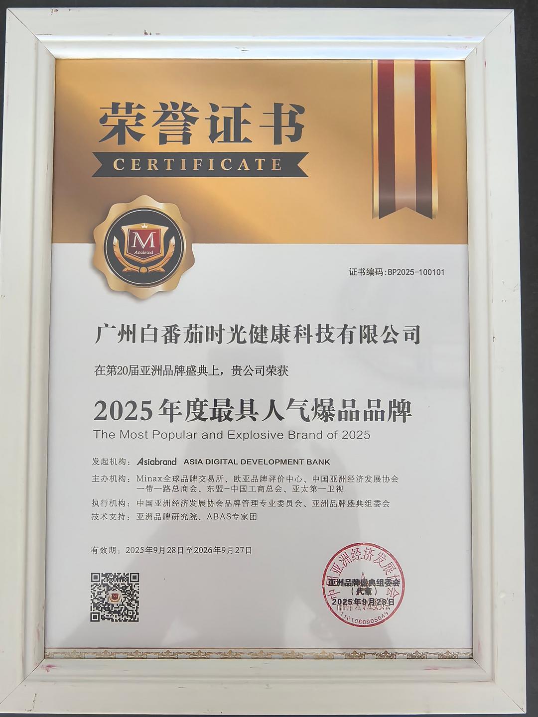 2025年9月28日,被誉为“亚洲品牌界奥斯卡”的第20届亚洲品牌盛典在香港湾仔国际会议中心圆满落幕。广州白番茄时光健康科技有限公司旗下核心产品——「白番茄时光」亮白丸,凭借扎实的科研根基、卓越的市场表现与深厚的用户口碑,从数百个参评品牌中脱颖而出,成功摘得“2025年度最具人气爆品品牌”大奖。